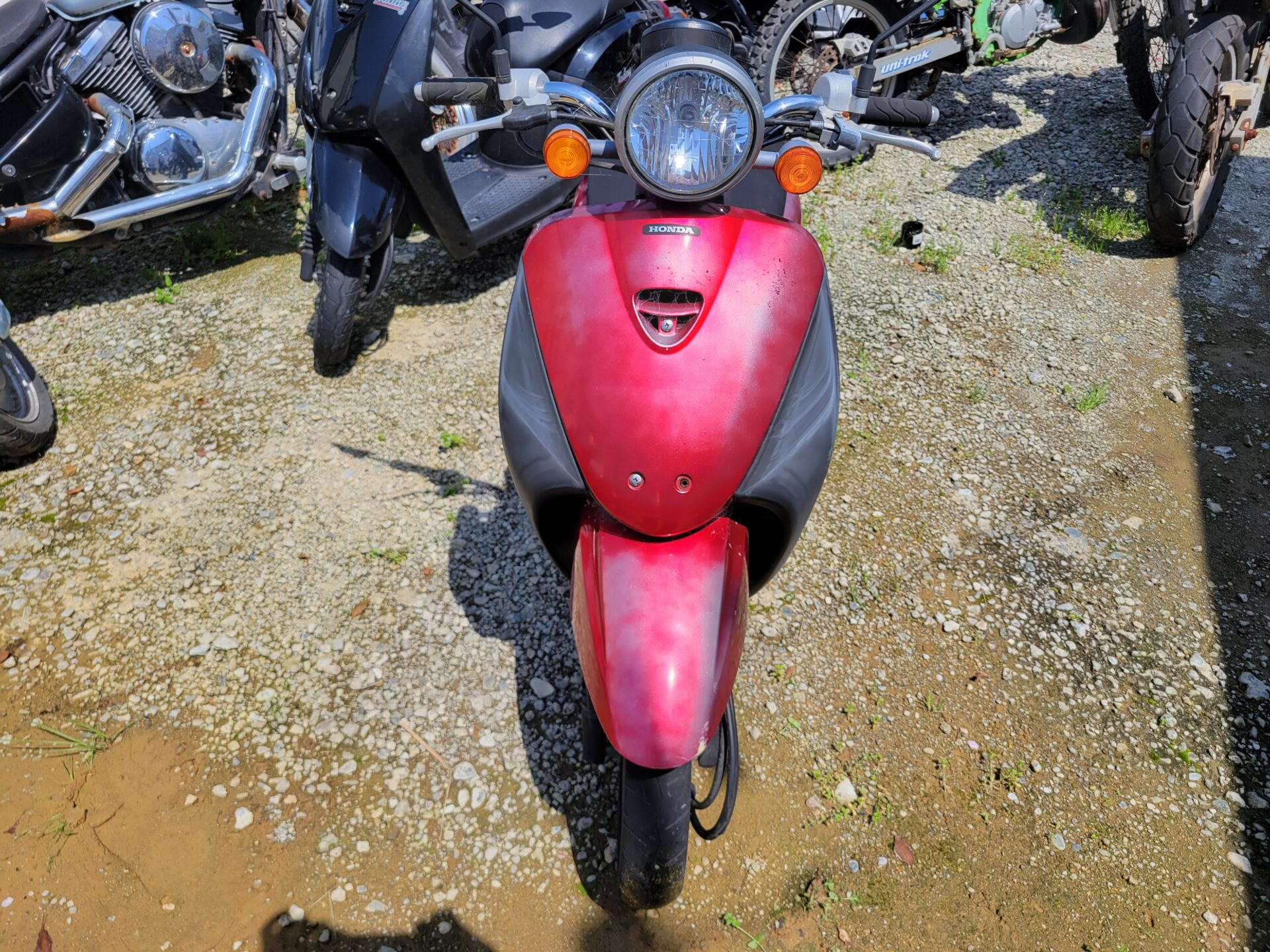 庭先放置バイク(原付きスクーター)の種類と状態は、ホンダの50CC、トゥデイFインジェクションタイプ、エアクリカバー削、バッテリカバー欠、トランク内一部カット加工、キック戻り不良、バッテリー✕、ミラー傷、インナーカウルあせ、右サイレカバ割、ライト電球切、インナーカウル傷です❌