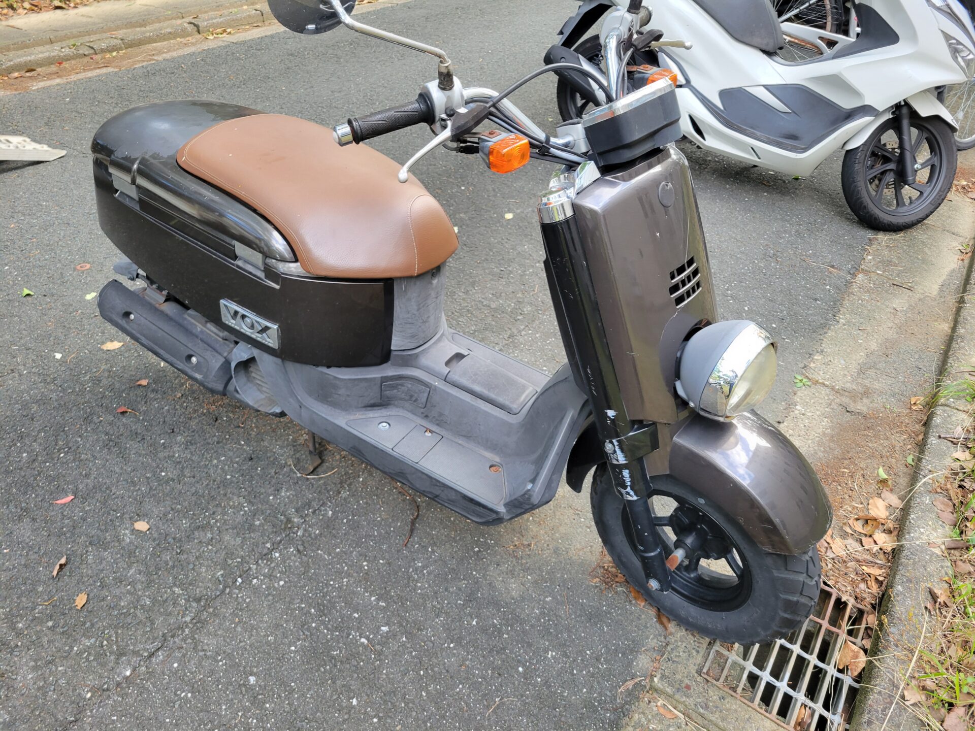 雨晒し放置バイク(原付きスクーター)の種類と状態は、ヤマハの50CC、ボックス50インジェクションタイプ、ウィンカー不灯、ミラー腐食、カウルキズ、ハンドル曲、シート汚、シートシワです❌