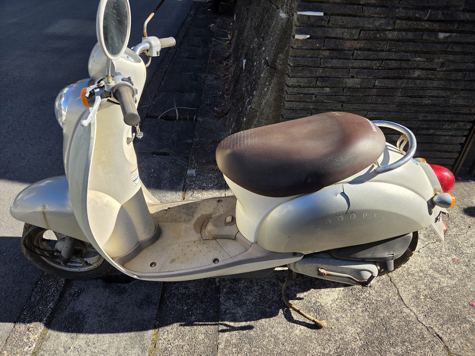 20年放置バイク(原付きスクーター)の種類と状態は、ホンダの50CC、クレアスクーピー50キャブレタータイプ、不動不明、レバー曲、外観ステッカ貼、サイドカバー割、外観あせ、外観腐食、ミラー傷、右サイレカバ欠品、シートレザー張替です❌