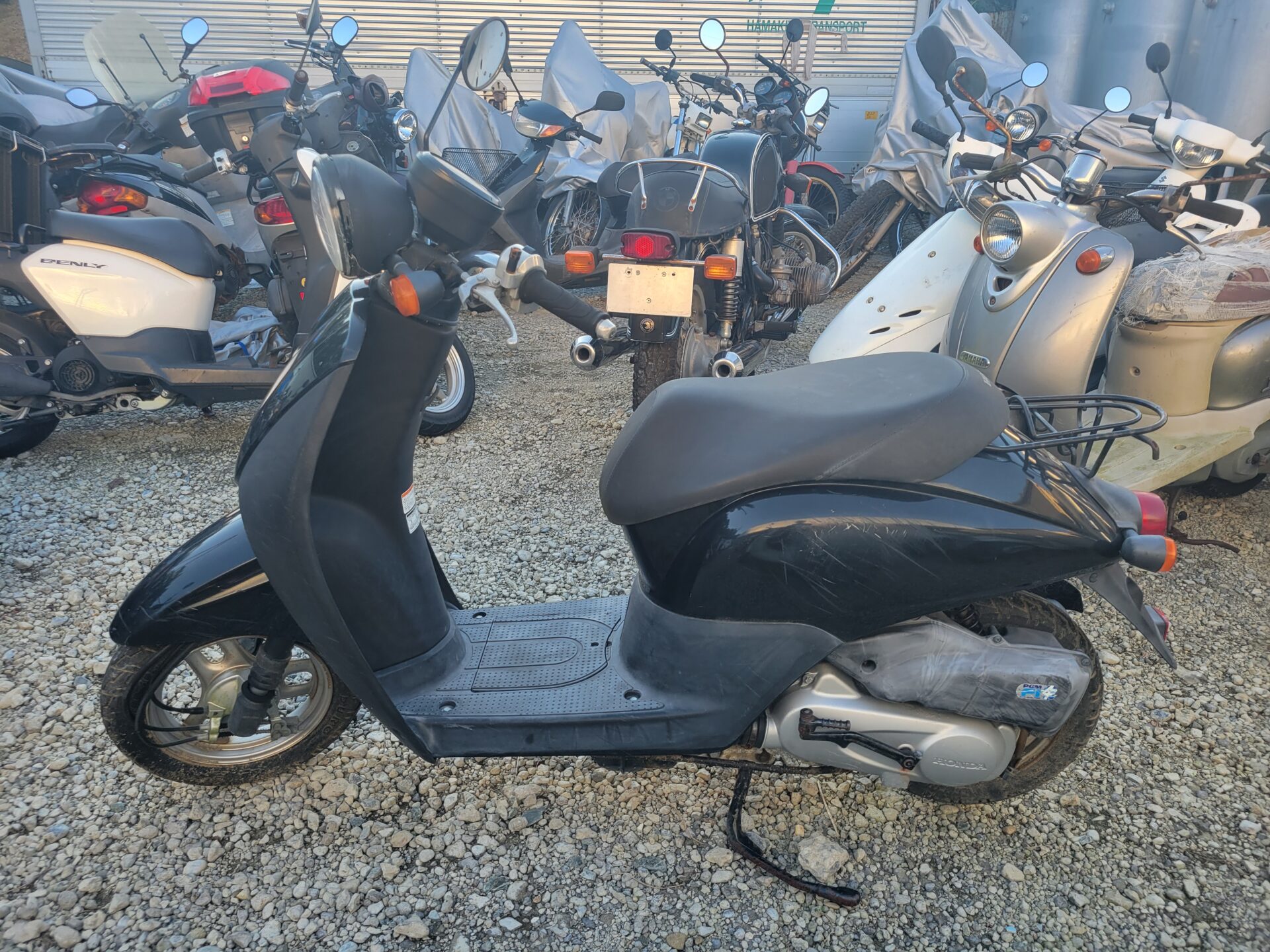 玄関前3年放置バイク(原付きスクーター)の種類と状態は、ホンダの50CC、トゥデイ50インジェクションタイプ、走行距離減算車、クラッチ音、フォークダストブーツ切、バッテリー欠品、外観あせ、ミラー削、ミラー腐食、シート下カバー破、シート下カバービス穴、右サイレカバ欠損、リアキャリア腐食です❌