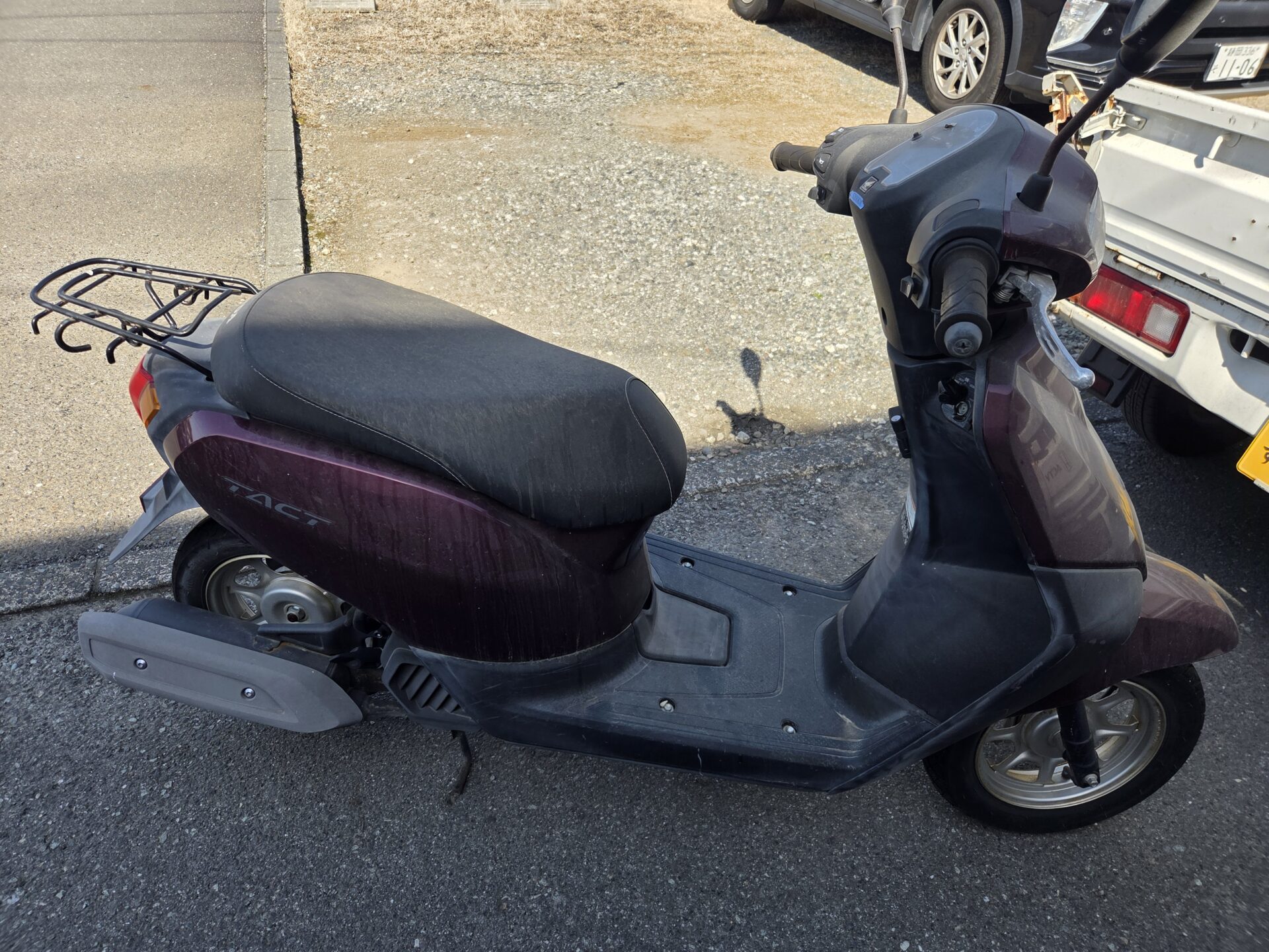 3年駐輪場放置バイク(原付きスクーター)の種類と状態は、ホンダの50CC、ベーシックタクト50インジェクションタイプ、ミラー傷、外観腐食、外観あせ、センタースタンド削、右サイレカバ割、右サイレカバ削、ハンドルエンド削です❌